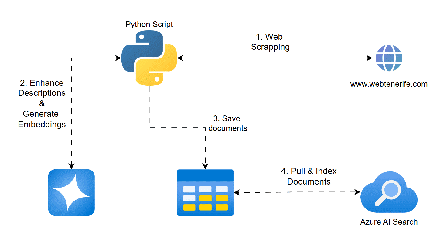 Vamos a utilizar Python y Playwright para hacer webscraping, GPT-4o mini en Azure AI Foundry para mejorar las descripciones de los lugares turísticos, Azure OpenAI Embeddings para vectorizar la información y Azure Blob Storage y Azure Table Storage para almacenar los datos. Finalmente, en un segundo artículo, te enseñaré cómo indexar esta información en Azure AI Search y hacer que tu Copilot pueda entender y responder sobre ella.